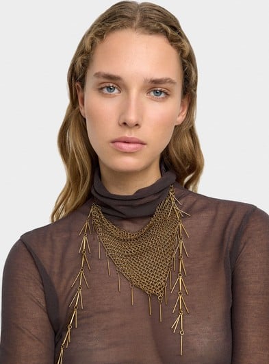Además, el formato babero tiene un papel clave en su impacto visual. A diferencia de los collares largos o de las cadenas finas, este tipo de accesorio se sitúa justo sobre el cuello y el escote, atrayendo la atención hacia el rostro y realzando la zona del cuello y los hombros. Es un formato ideal para equilibrar prendas de escote cerrado o para crear contraste sobre tejidos lisos. Los estilistas coinciden en que una pieza así puede transformar un conjunto sencillo en una propuesta elegante y de gran presencia.