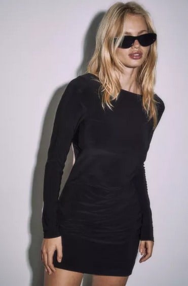 Para quienes buscan un look más atrevido, Stradivarius presenta un vestido corto de 22,99 euros en color negro que destaca por su espalda descubierta con cintas a tono. Se trata de un diseño fluido con cuello redondo y manga larga que combina discreción frontal con impacto visual en la parte posterior. La mezcla entre simplicidad y sensualidad lo convierte en una opción idónea para eventos nocturnos o celebraciones en clubes.