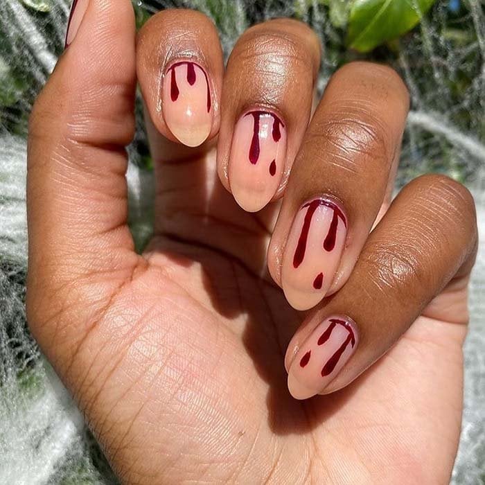 Otro diseño que ha ganado popularidad es el efecto sangre, ideal para complementar disfraces de vampira o zombie. Se consigue aplicando una base clara o nude y luego añadiendo gotas de esmalte rojo oscuro en la parte superior, dejando que caigan de manera irregular. Aunque parece elaborado, este diseño de uñas para Halloween es sorprendentemente fácil de realizar con un pincel fino o incluso con un palillo de madera.