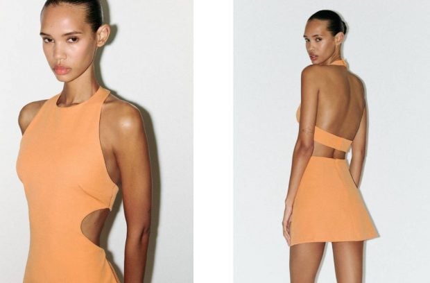 Vestido corto naranja con cut outs laterales. (Zara)