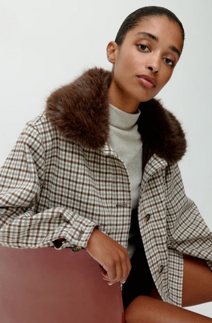 Esta chaqueta también está con cuello de pelo negro y cuadros marrones y grises sobre fondo beige. a combinar con: