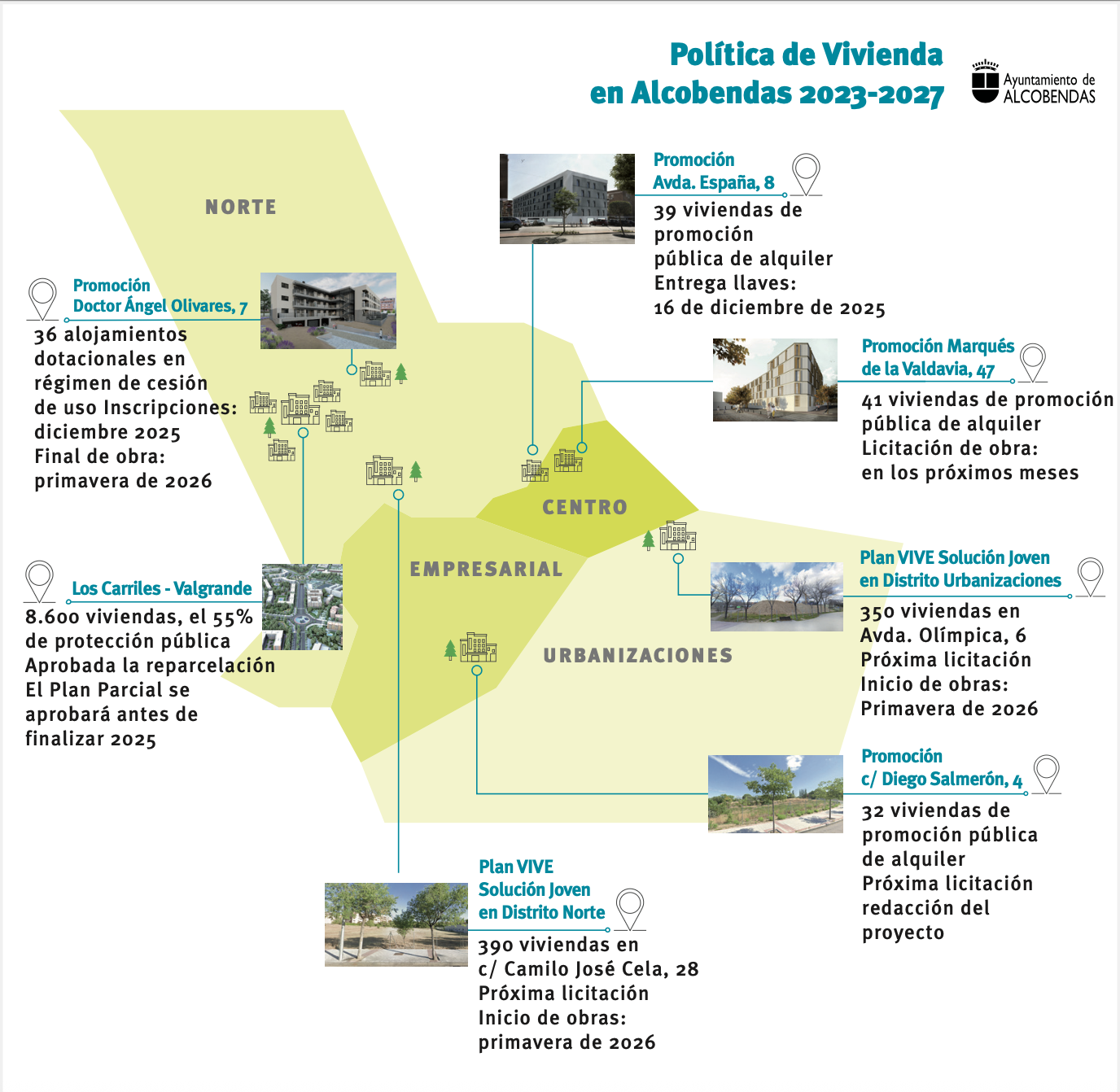 «Este ambicioso plan de vivienda es una prioridad para nuestro equipo de Gobierno del Partido Popular. Un plan que prevé la creación de 886 viviendas públicas en esta legislatura y hasta 8.600 nuevos hogares con el nuevo desarrollo de Los Carriles-Valgrande, que cuenta con viviendas pensadas para todas las edades, para los jóvenes, familias… desde estudios hasta unifamiliares y en régimen de alquiler o venta, de las cuales el 54% es de protección. Queremos que nuestros hijos y nietos se queden a vivir en Alcobendas», explica García Alcántara.