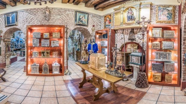 Entrar a ‘El Ángel’ es como entrar al almacén muy bien ordenado de una diócesis milenaria: cálices dorados en las estanterías, pequeñas figuritas de santos y vírgenes por todos los mostradores, estatuas a tamaño real de Jesús nada más cruzar la puerta, albas de sacerdotes en un estado impecable. Mantener un taller que construya y mantenga todos estos objetos, además de la tienda, es tarea imposible: «Nosotros solo tenemos talleres de restauración de orfebrería y de restauración de imaginería, mientras que el resto de productos son por encargo».