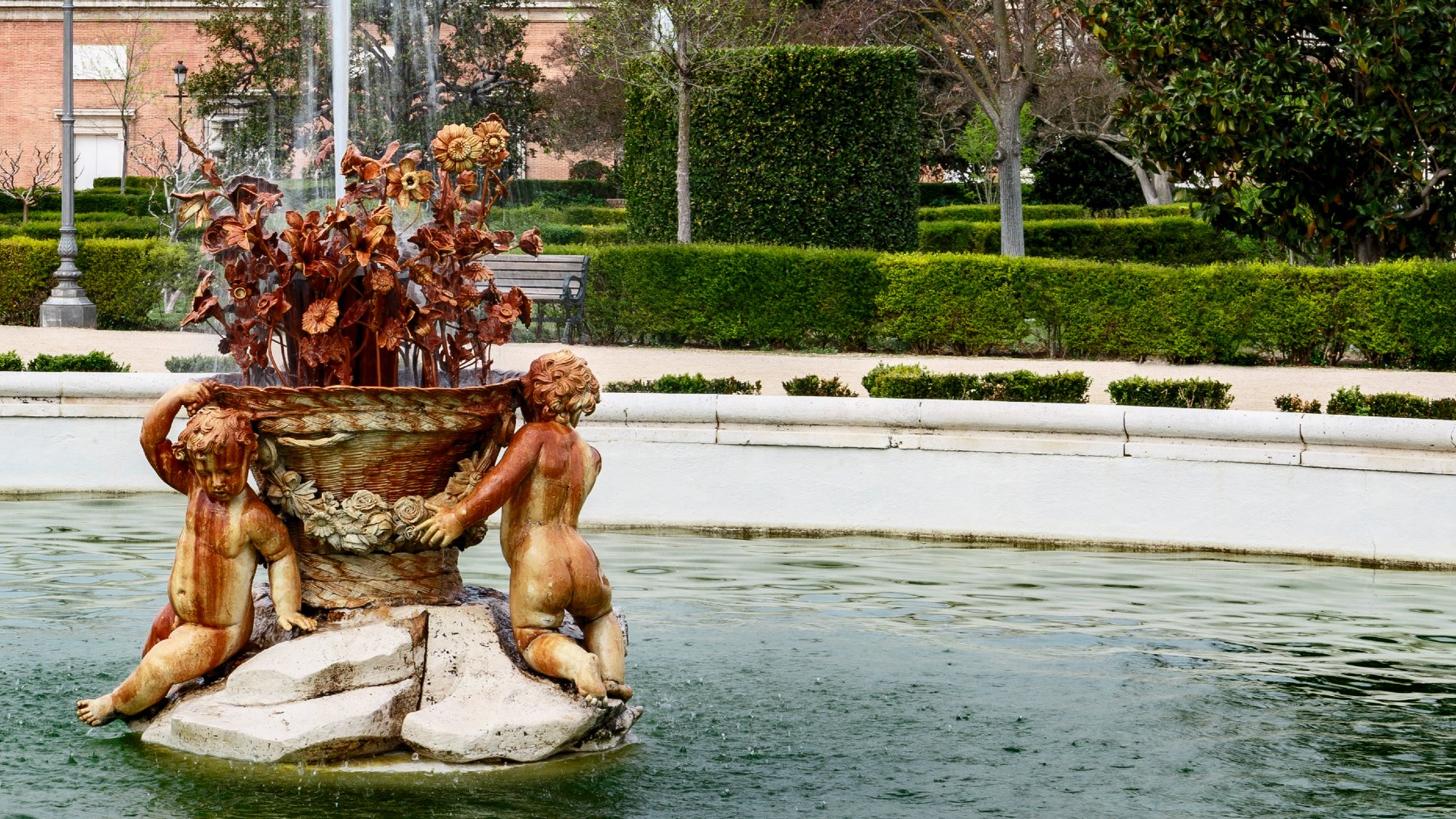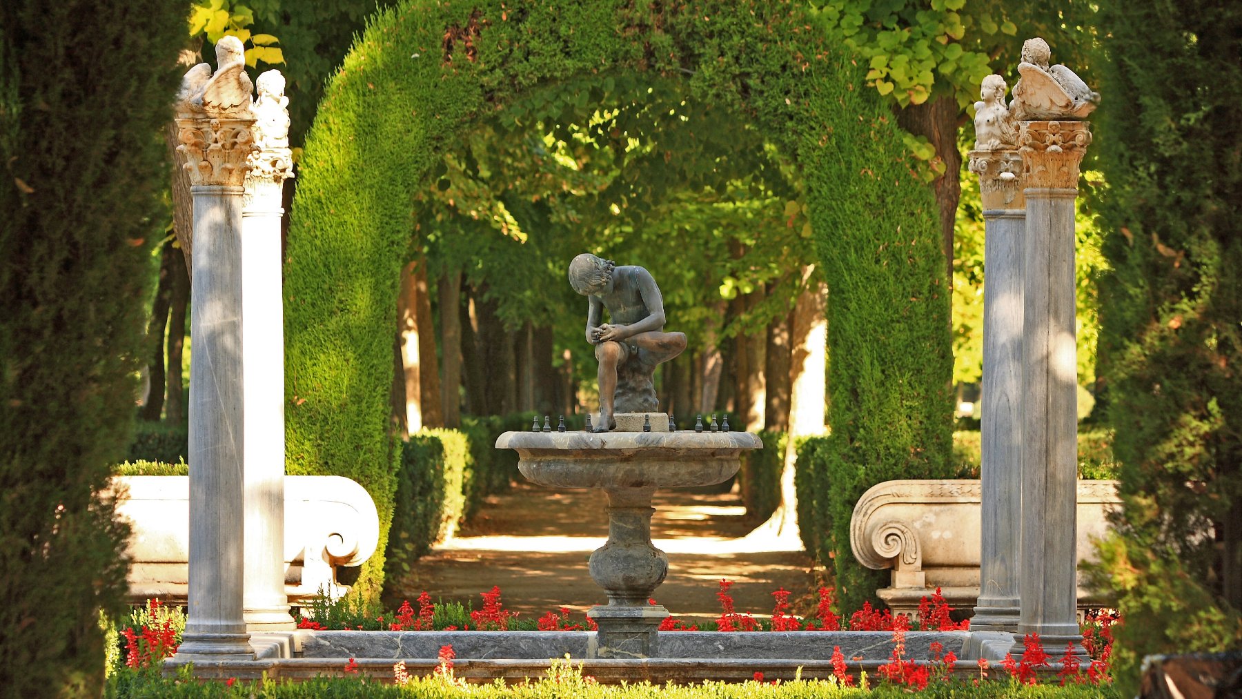 No menos encantadores son los Jardines de la Isla, diseñados a orillas del tajo sobre una pequeña península. Rodeado por canales y adornado con fuentes monumentales, fueron los preferidos de Felipe II. La Fuente de Hércules y Anteo, la Fuente de Ceres o la Fuente del Reloj forman parte de un conjunto escultórico de enorme valor artístico que combina el mito, el agua y la naturaleza en perfecta sintonía. Junto a ellos, el Jardín del Parterre, de inspiración francesa, se distingue por su geometría y sus parterres florales, mientras que el Jardín de Isabel II, más recogido y romántico, conserva la atmósfera serena del siglo XIX.