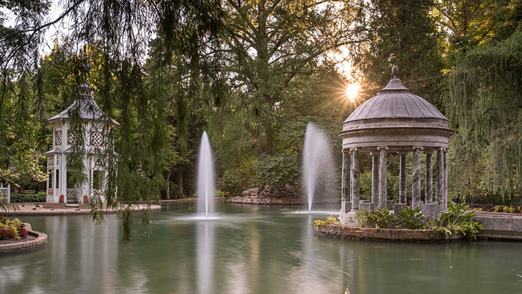 El Jardín del Príncipe es quizá el más extenso y simbólico. En él, los caminos sombreados, las avenidas flanqueadas por plátanos centenarios y los estanques con esculturas mitológicas componen un auténtico paisaje de cuento. En su interior se esconde uno de los rincones más singulares de Aranjuez: el Estanque Chinesco, con su pabellón oriental que parece flotar sobre el agua.