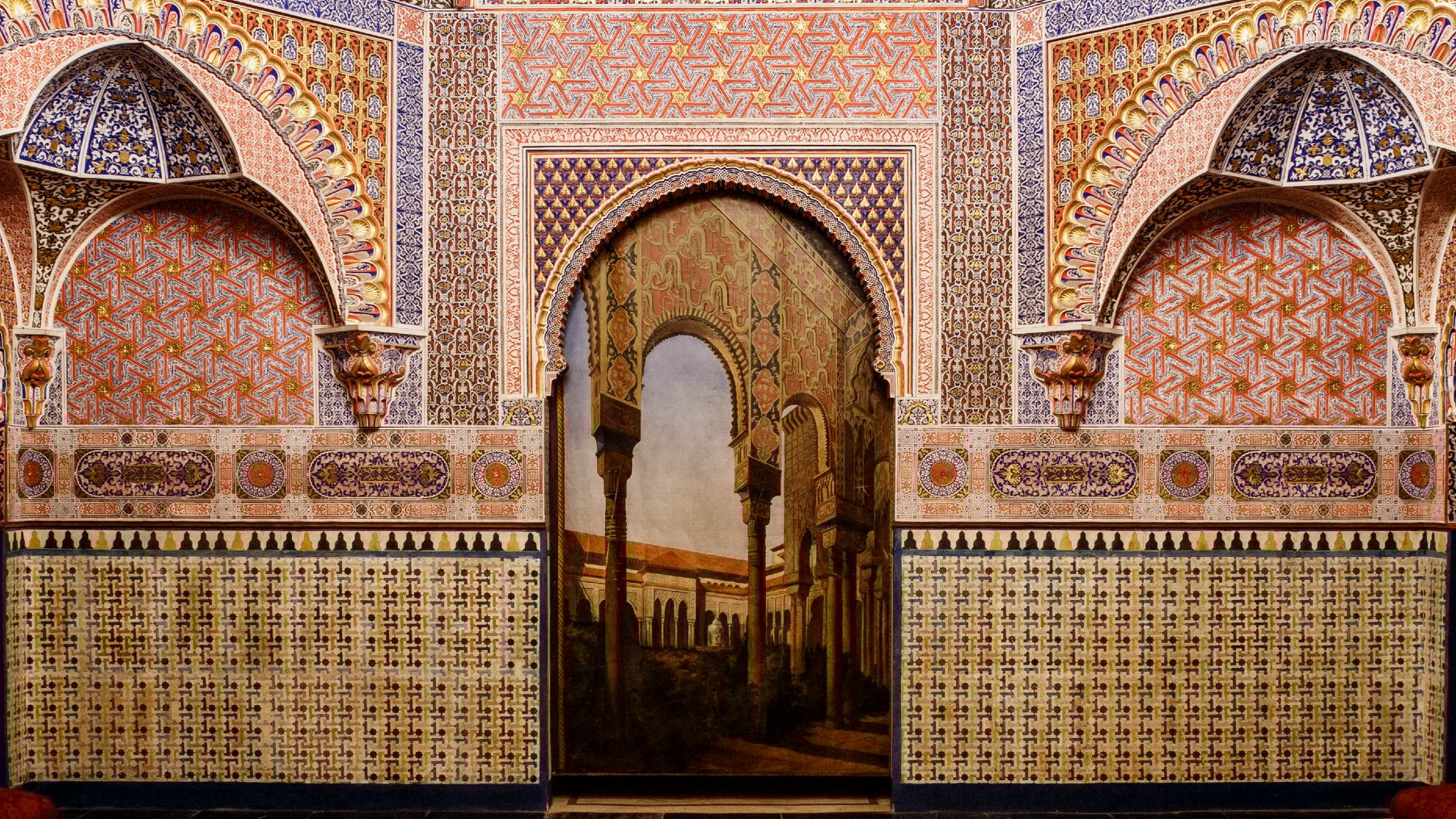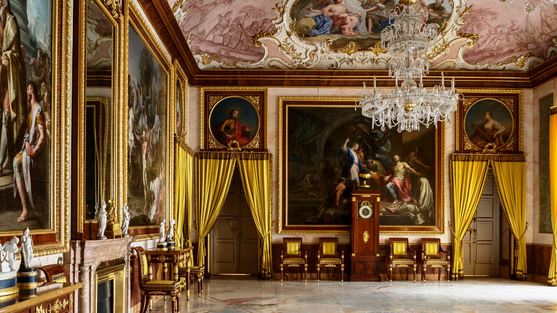 Entre los espacios más emblemáticos destacan el Salón del Trono o de Embajadores, con sus paredes cubiertas de terciopelo carmesí y el mobiliario de época isabelina; el Gabinete de Porcelana, una joya única del rococó europeo recubierta por completo de porcelana de la Real Fábrica del Palacio del Buen Retiro; y el Comedor de Gala, decorado con bóvedas del siglo XVIII.
