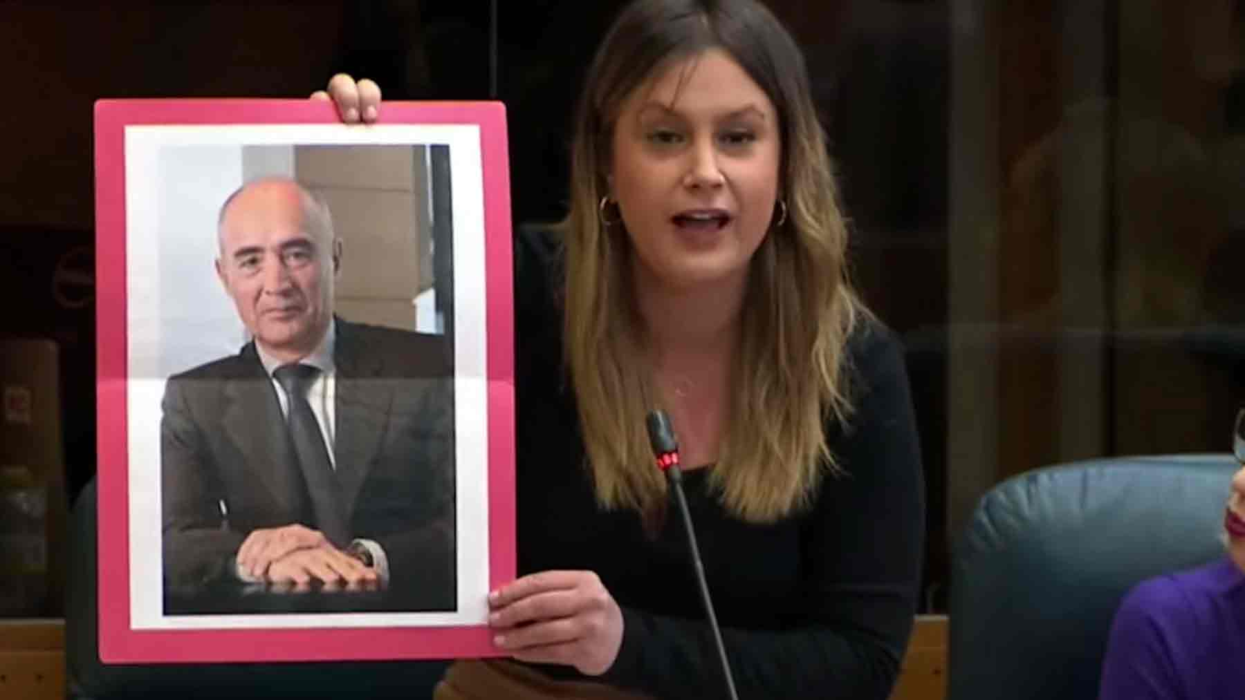 «Vamos a ponerle cara a la indecencia para que los madrileños sepan quién se está llevando su dinero», ha proclamado desde su escaño la diputada de la formación morada, al tiempo que mostraba una fotografía del presidente del Real Madrid y del grupo ACS, Florentino Pérez.
