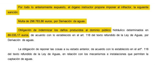 No fue hasta 2019 cuando la Confederación Hidrográfica del Tajo, organismo dependiente del Ministerio de Transición Ecológica, pone una multa de 296.783,86 euros por las captaciones ilegales, donde obliga al Ayuntamiento a indemnizar por los daños al dominio público hidráulico en la cuantía de 89.035,17 euros.