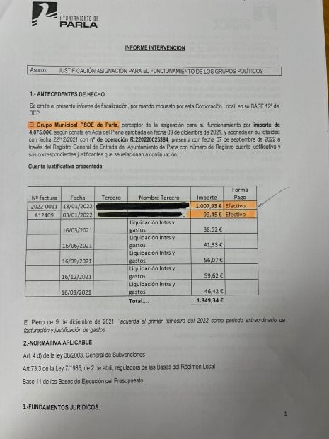 Sin embargo, desde Vox recuerdan que no se pueden pagar facturas en efectivo superiores a 1.000 euros, aunque sobrepase esa cantidad por el IVA. «La intervención dice que el concepto del gasto es aceptable, pero no dice nada de la forma de pago en efectivo, porque eso lo realiza el PSOE de Parla y la competente es la Agencia Tributaria», señala el portavoz de Vox, Juan Marcos Manrique.
