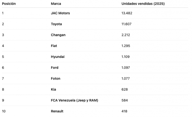 Unos datos en los que sólo se incluyen las marcas registradas en la Cámara Automotriz de Venezuela (Cavenez), ya que hay que tener en cuenta que hay algunas marcas chinas que operan en Venezuela, pero no están registradas en la organización, como es el caso de Chery, BAIC, GWM, pero que no están incluidas en este ranking oficial.