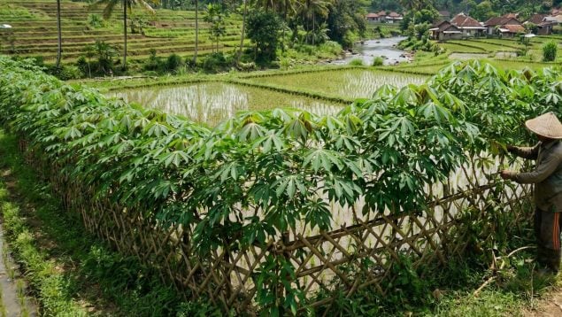 Los agricultores indonesios plantan tallos de yuca, una planta muy resistente, a poca distancia unos de otros a lo largo del perímetro de sus parcelas. Con el paso del tiempo, los tallos crecen y se entrelazan para formar cercas vivas densas y robustas. Esta barrera natural impide el paso de animales salvajes, como los jabalíes, que habitualmente destrozan las cosechas de arroz o maíz.