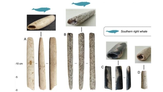 La clave no está en un hueso aislado, sino en un conjunto coherente: abundancia de restos, marcas de corte asociadas al despiece y, sobre todo, artefactos de caza especializados. El artículo describe piezas interpretadas como partes de arpones (astiles y elementos de encaje) hechos con costillas de ballena, con medidas y formas repetidas, señales de trabajo y zonas preparadas para el amarre.