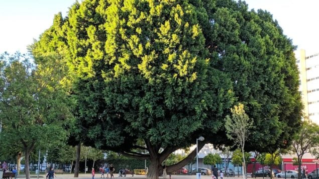 En el Parque Rectora Rosario Valpuesta se alza un imponente ejemplar de Ficus microcarpa, conocido popularmente como laurel de Indias. Su gran copa y su tamaño lo convierten en uno de los árboles más llamativos del arbolado urbano sevillano y en un auténtico refugio natural para quienes buscan sombra durante los meses más calurosos.