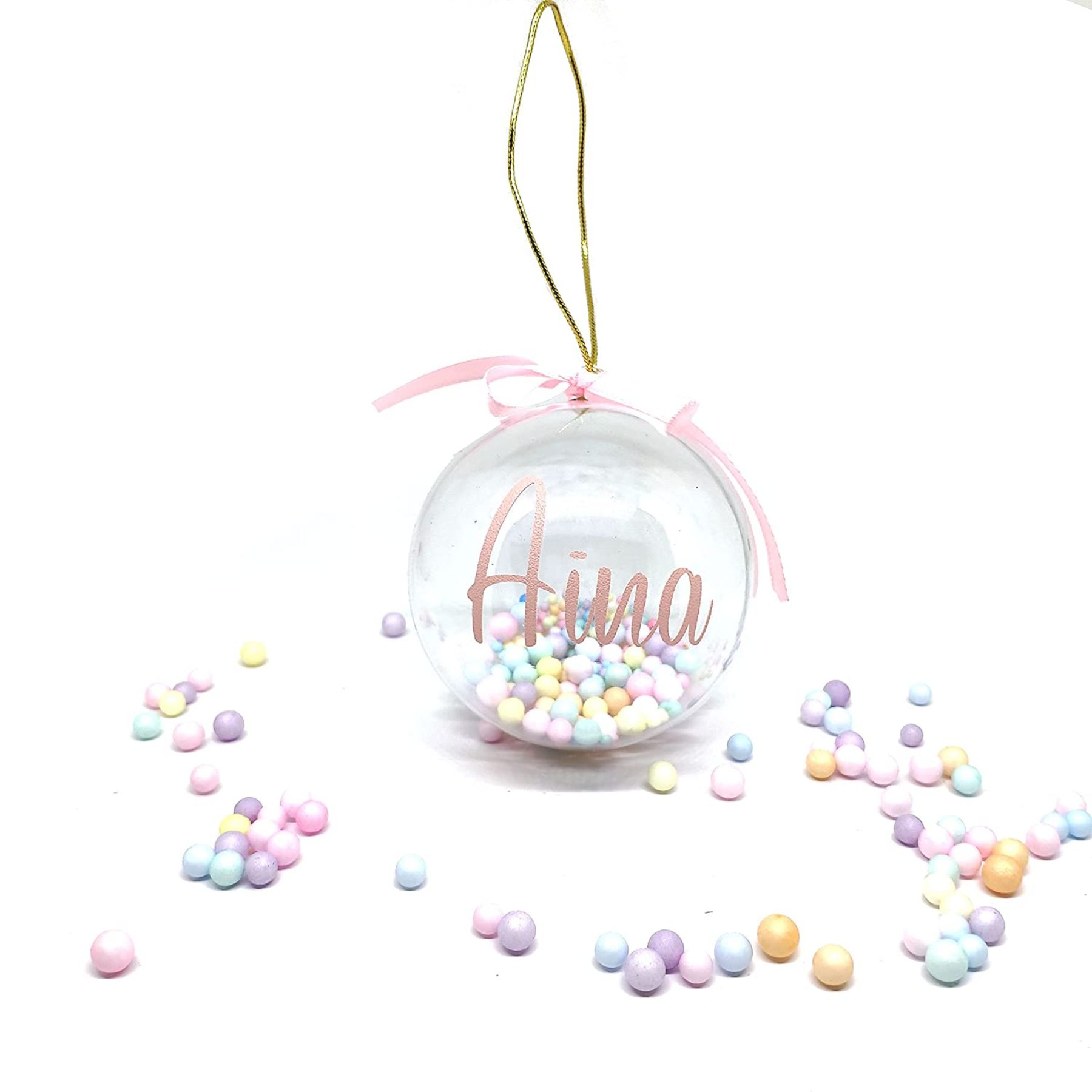 También entre las bolas personalizables de Amazon que más se venden estos días, tenemos la bola que es transparente y que va además rellena de pequeñas bolitas de colores. Le pueden grabar el nombre que queramos con vinilo adhesivo y el precio es de 6,60 euros.