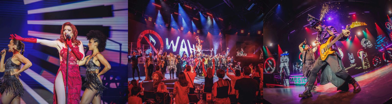 En el segundo acto, el público accede al Teatro WAH y comienza la magia. Más de 40 artistas suben al escenario para reinterpretar grandes himnos de la música, fusionando estilos como rock, pop, ópera, flamenco y electrónica en un show de gran formato que sorprende desde el primer instante.