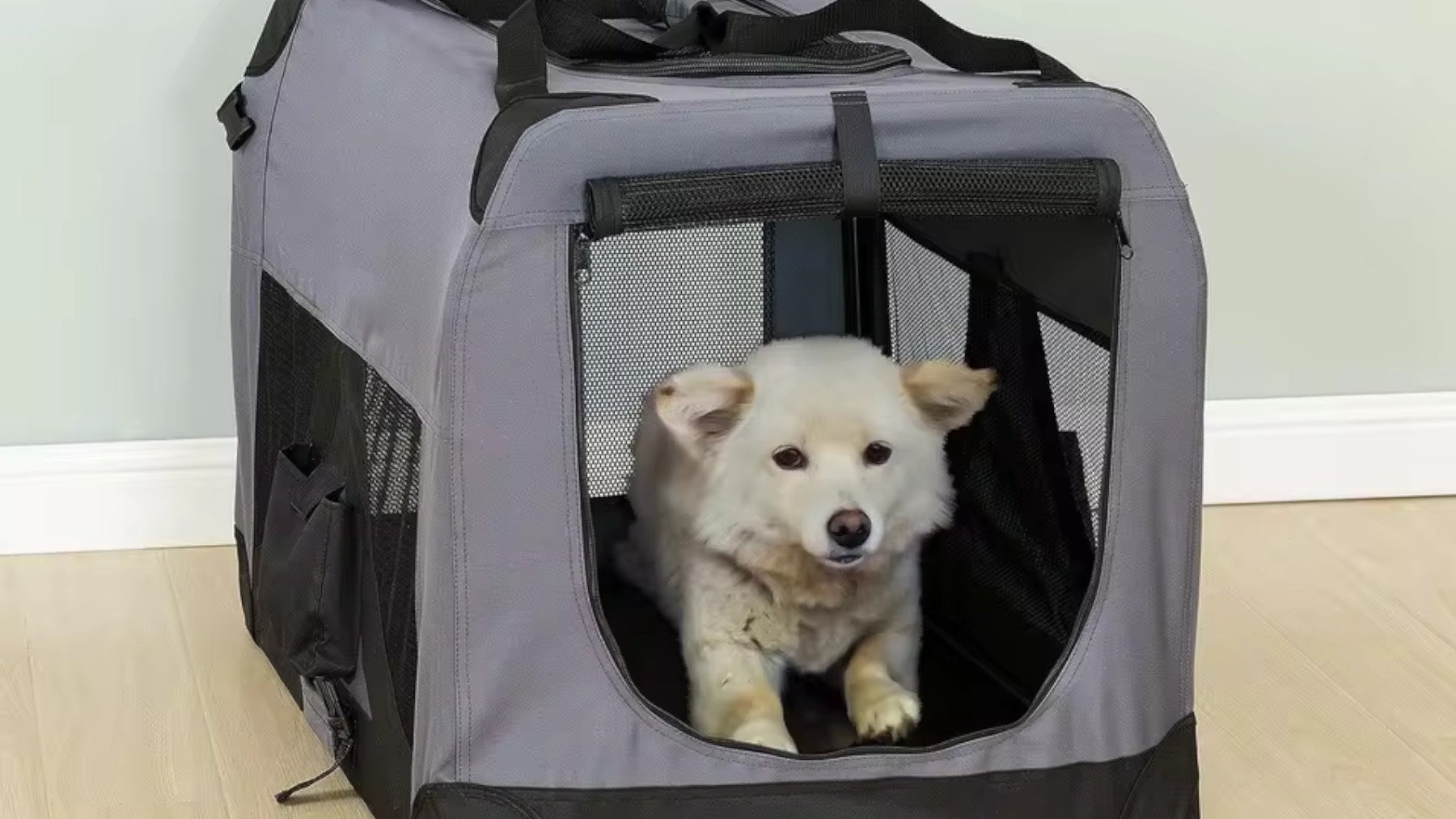 - «Cuando lo plegas se sujeta con dos cinchas con clip y tiene asa de transporte. La entrada es amplia y facilita que los perros se familiaricen. Producto de 10.»