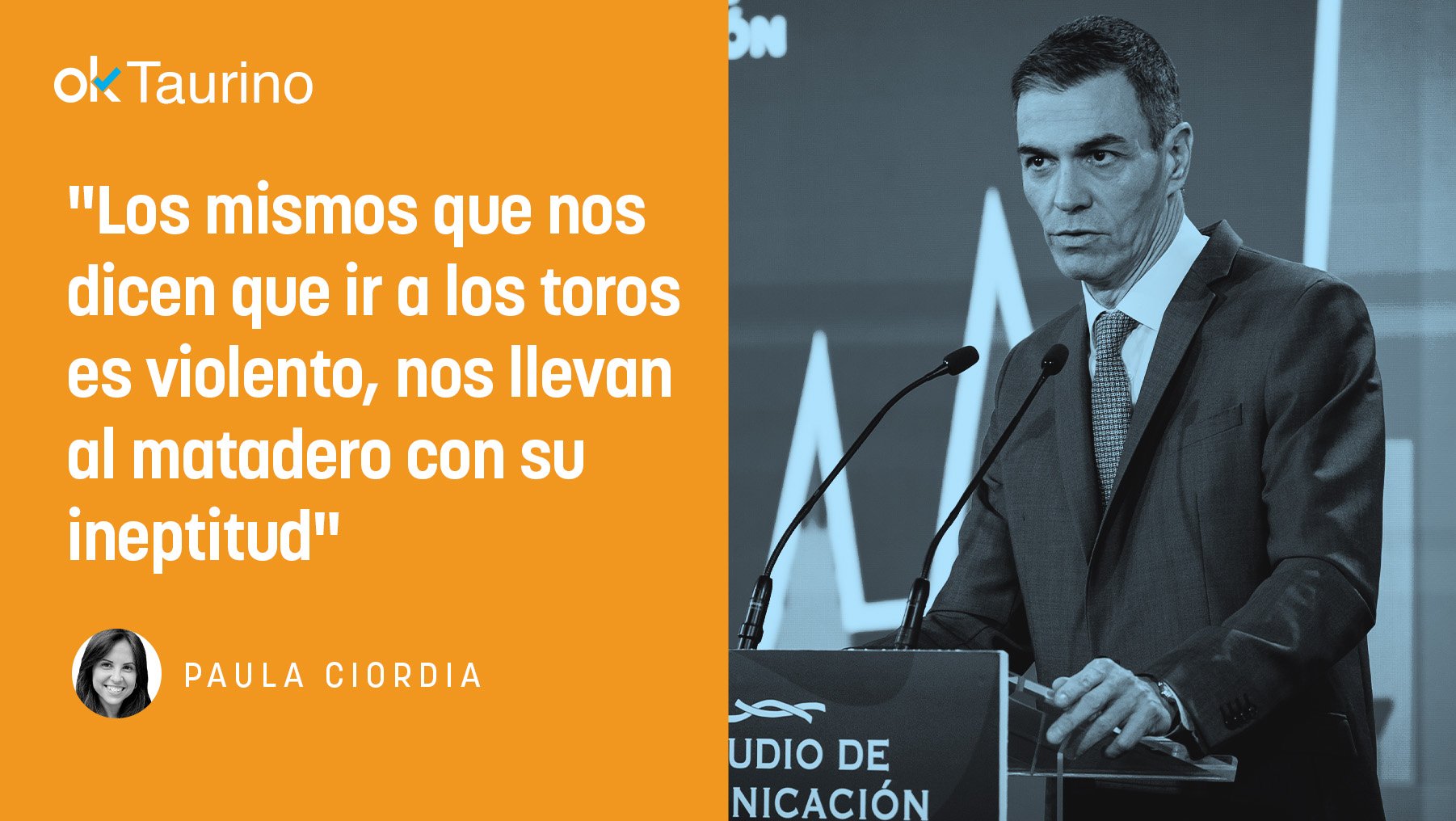 Insisto: los mismos que nos dicen que ir a una plaza de toros es violento y que los menores no deben ir porque aprenden a naturalizar la violencia, son los que nos tratan peor que a ganado, llevándonos al matadero con su ineptitud. Ya vale. J’accuse al Gobierno de Pedro Sánchez de hacer terrorismo de Estado: una pandemia terrorífica, una DANA catastrófica, un apagón tercermundista, unas infraestructuras que se han vuelto en una atracción de feria…
