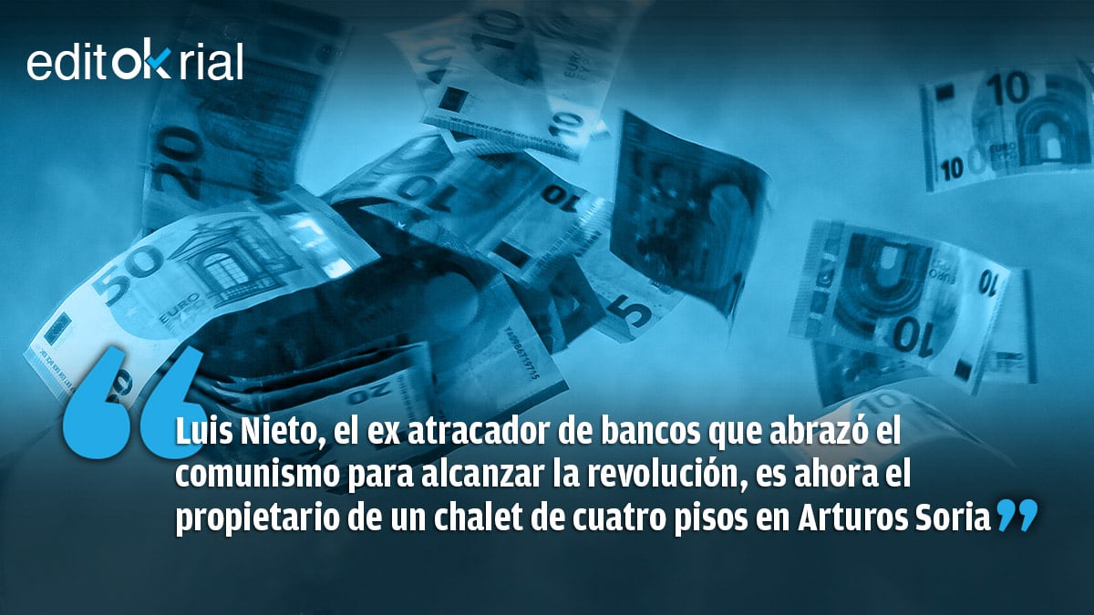 Que alguien se compre un chalet de cuatro plantas en una zona próxima a Arturo Soria, en Madrid, no merecería mayor comentario editorial. Si el propietario es un antiguo atracador de bancos que pagó por ello con años de cárcel, tampoco. Pero si el dueño del chalet familiar es, además de todo eso, el portavoz de Podemos en Madrid, Luis Nieto, la cosa adquiere una nueva dimensión. Porque Luis Nieto, que de joven iba de independentista revolucionario y se abrazó al comunismo, mientras le daba por atracar sucursales bancarias, ha descubierto las bondades del capitalismo hasta el punto de comportarse como esos burgueses a los que Podemos estigmatizó con enorme violencia verbal. ¿Se acuerdan de la casta? ¿Recuerdan con qué odio hablaban cuando conocieron que Luis de Guindos, por ejemplo, se había comprado un ático de 132 metros cuadrados?