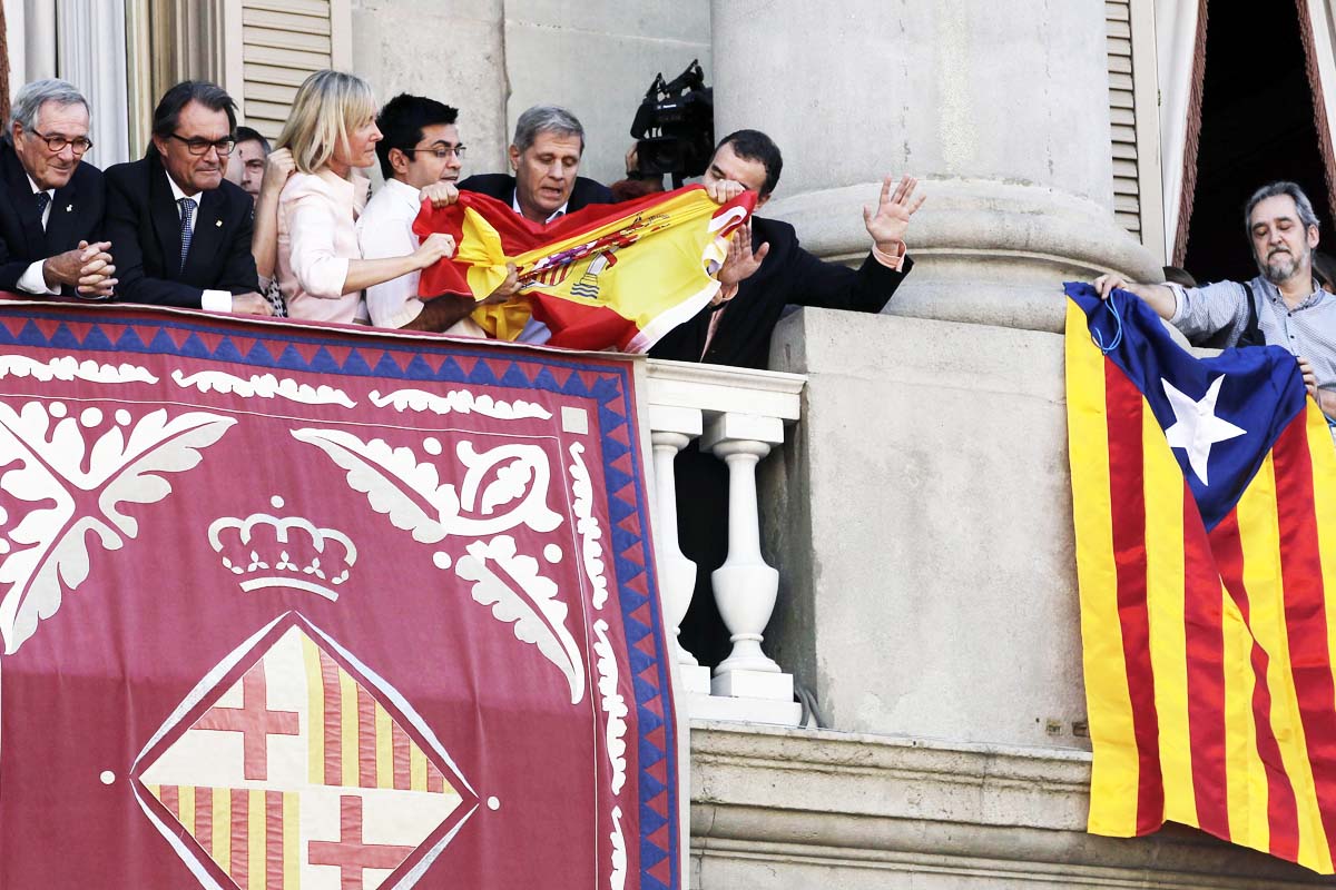 Ante la pasividad del president Artur Mas y la alcaldesa Ada Colau, que se encontraban presentes, el concejal popular Alberto Fernández optó por colocar también la bandera española “para defender a los que se sienten españoles y catalanes”, como explicó luego, mientras una parte del público le abucheaban y coreaban gritos de «independencia».