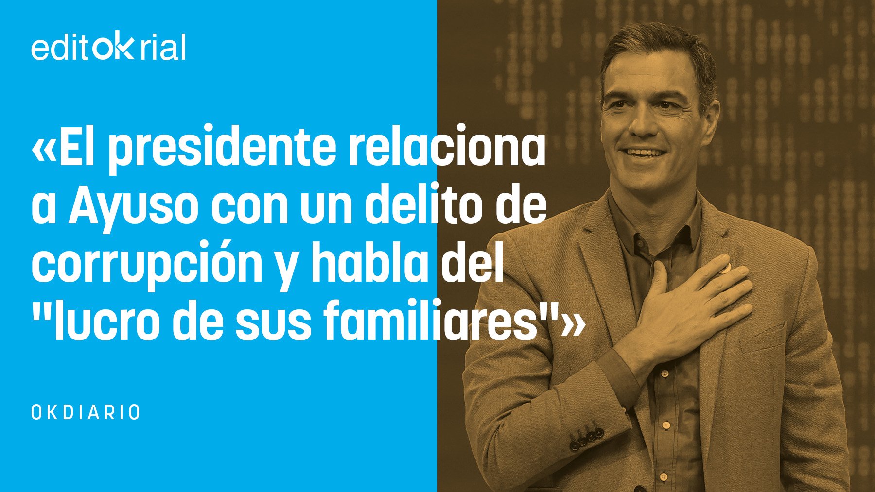 Ahora la situación es distinta, porque el jefe del Gobierno, Pedro Sánchez, aprovecha su nuevo libro para calumniar a la presidenta de la Comunidad, Isabel Díaz Ayuso, y a su familia por la relación laboral que tuvo su hermano con una empresa adjudicataria de un contrato del Ejecutivo regional en tiempos del covid. La calumnia, en este caso, es carne de querella, porque Sánchez, en un ámbito privado y meramente profesional al margen de la política, sostiene que hubo «lucro de sus familiares en plena pandemia». Y ese lucro lo vincula claramente a la corrupción. Y deja constancia por escrito.