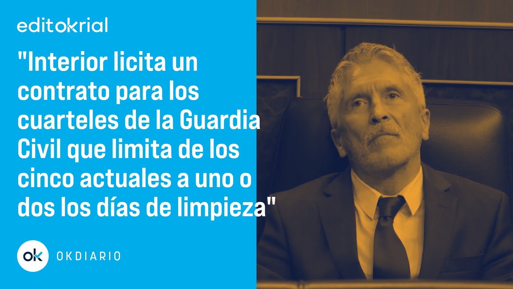 En la licitación del nuevo contrato para los cuarteles de la Guardia Civil, el Ministerio de Interior ha decidido practicar un sustancial recorte que cabría calificar de antihigiénico. O sea, de muy cochino, pues para ahorrarse unos euros, Marlaska ha decidido que la limpieza de los acuartelamientos pase de ser cinco días a la semana a tan sólo dos o incluso simplemente uno. Hasta ahora, el ahorro venía por la vía de no invertir en las labores de mantenimiento de las instalaciones y OKDIARIO viene dando cuenta del lamentable estado que presentan. Pero en esta ocasión, Marlaska ha decidido ir un paso más allá y recortar en lejía y jabón. La Asociación Unificada de Guardias Civiles (AUGC) ha puesto, con razón, el grito en el cielo y exigido explicaciones, pues la cosa ya pasa de castaño a oscuro. Quiere saber con qué criterio el Ministerio de Interior ha decidido reducir la frecuencia de limpieza en numerosas unidades respecto a licitaciones anteriores, y qué parámetros objetivos se han seguido para decidir qué unidades mantienen la limpieza diaria (de lunes a viernes) y cuáles sufren una reducción de frecuencia, que son muchas. La norma exige garantizar una serie de condiciones de salubridad, por lo que la pregunta es quién asumirá la limpieza y desinfección de baños, vestuarios y duchas los días en que la empresa adjudicataria no preste servicio.