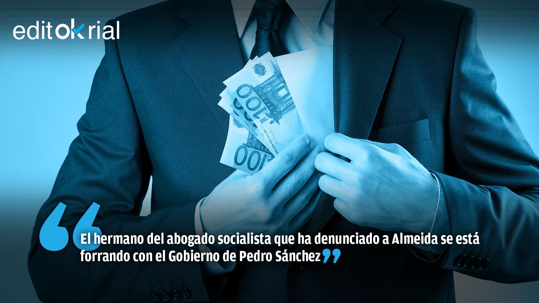 ¿Y qué tendrá que ver que su hermano sea socialista con que el abogado Fernando Pamos de la Hoz haya decidido emprender acciones legales contra Almeida?, se preguntará algún lector despistado. Hombre, pues que el historial del letrado también está vinculado al PSOE, hasta el punto de encargarse de su defensa legal tras el famoso Tamayazo. No estamos ante la irrupción de un abogado con ganas de que se haga justicia, sino de un abogado con ganas de que la justicia le hinque el diente a Almeida. Y es que Fernando Pamos de la Hoz es muy selectivo a la hora de llevar a cabo sus denuncias. Se excita con los casos que puedan afectar al PP y, sin embargo, está por ver cuándo ha hecho lo propio con casos que puedan afectar al PSOE. Su hermano se ha forrado con Sánchez, él juega a favor de Sánchez y a estas alturas quien quiera chuparse el dedo aceptando que su denuncia contra Almeida es por puro altruismo está en su derecho de seguir chupándose el dedo hasta sacarle punta.