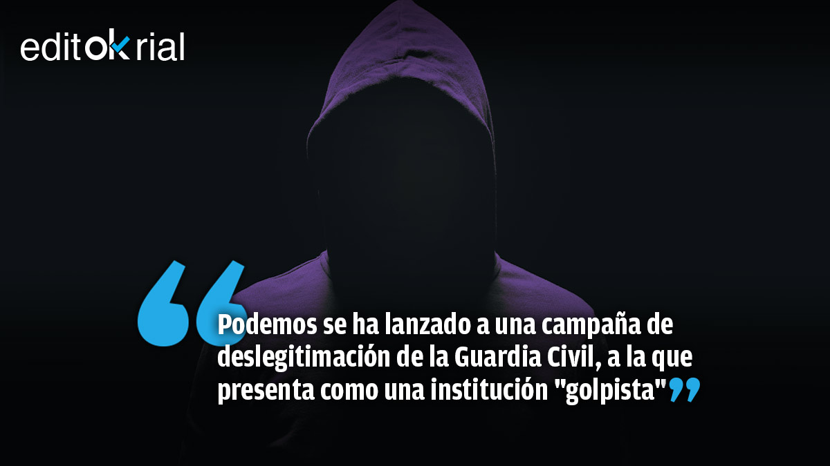 Después de que Pablo Iglesias acusara a Vox en el Congreso de los Diputados de pretender un golpe de Estado, la formación de extrema izquierda se ha lanzado a una campaña de desprestigio de la Guardia Civil a través de un grupo denominado ‘Guerrilla 2.0’-o sea, Podemos disfrazado- que se ha servido de un vídeo para relacionar a la Benemérita con el golpe de Tejero, cuyo rostro ha sido sustituido por el del diputado de Vox Iván Espinosa de los Monteros. La factoría de creación de Podemos es un derroche de sectarismo totalitario, un proyector de bilis. Lo grave es que detrás está el vicepresidente del Gobierno de España. Y eso es lo que representa una amenaza a la convivencia y un peligro para la democracia.