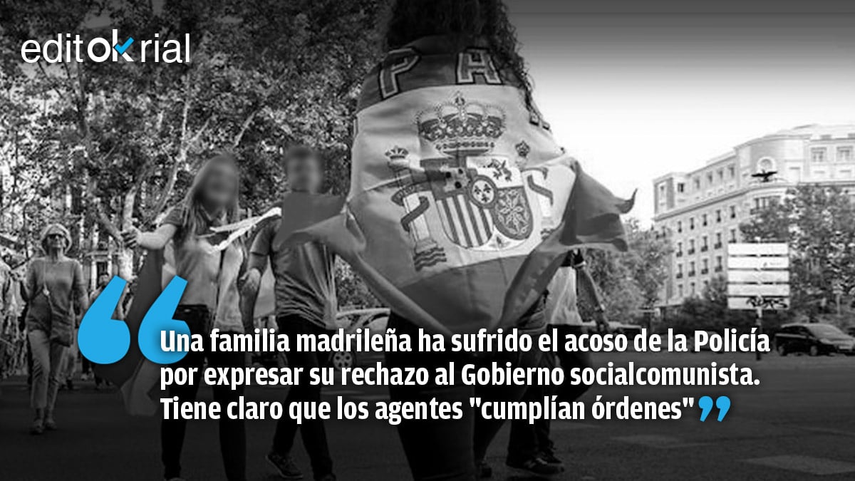 Cuando la Policía, siguiendo órdenes de arriba (o sea, del Gobierno socialcomunista) pide identificarse a una familia por llevar una bandera de España con el lema «Gobierno dimisión» es que la situación ha adquirido tintes alarmantes. El acoso a los derechos y libertades llevado a cabo por el Ejecutivo empieza a ser sistemático, más propio de una dictadura que de un Estado de Derecho. En el madrileño Paseo de la Habana, la familia de María del Prado viene expresando desde hace días su oposición al Gobierno de Pedro Sánchez. Lo hace respetando la distancia de seguridad, con una bandera de España en la que se pide la dimisión del jefe del Ejecutivo. ¿Qué hay de malo? ¿Por qué motivo se han convertido en sospechosos? ¿Qué ha llevado a la Policía a pedirles la documentación de forma reiterada?