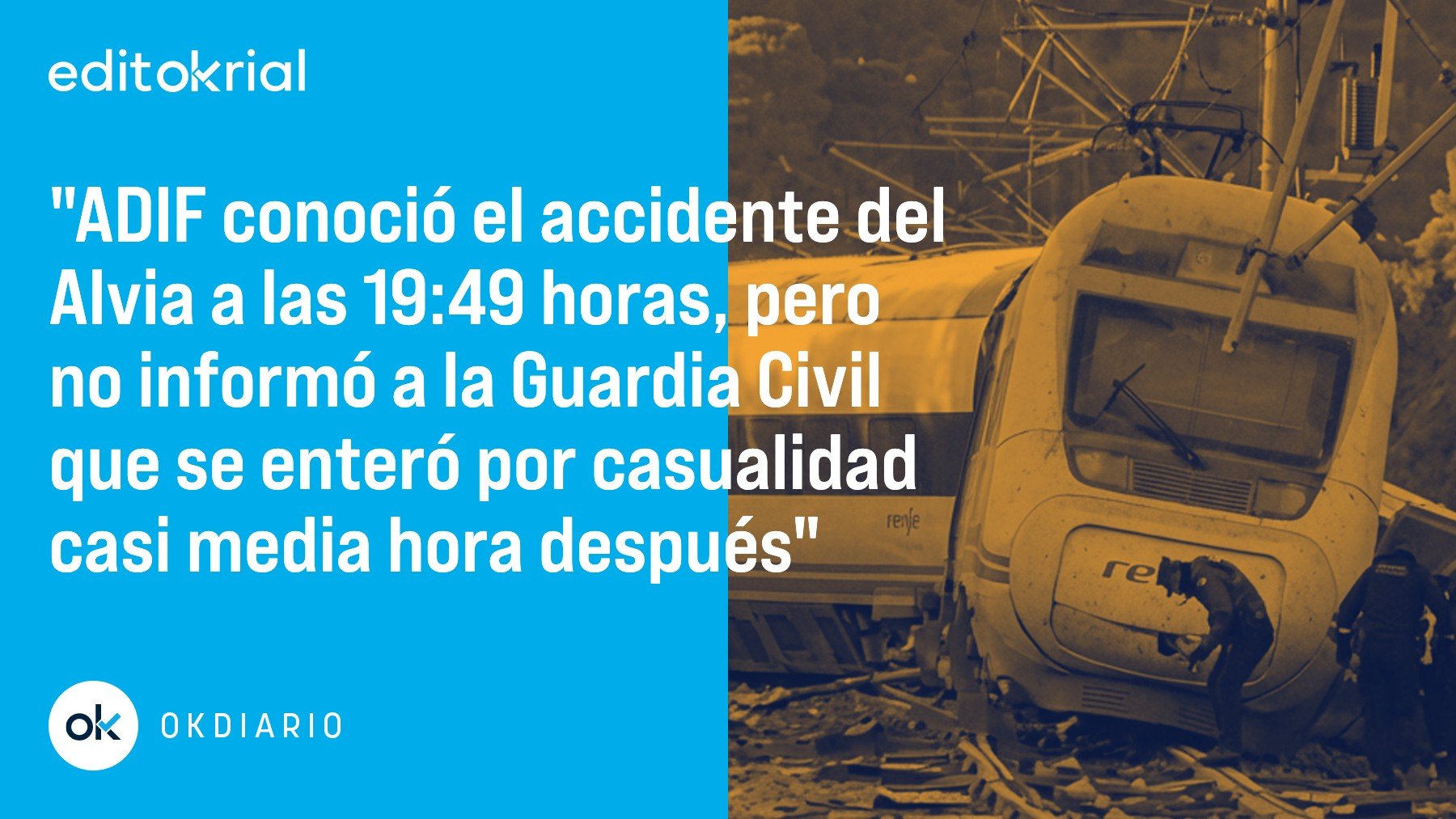 Más allá de que cada día que pasa se afianza la hipótesis de que el mortal accidente ferroviario de Córdoba se debió a un fallo de la vía, hay otro aspecto crucial que merece ser tenido en cuenta: el centro de control de ADIF se pone en contacto con la interventora del Alvia a las 19:49 horas del domingo, que le anuncia que está herida y el tren está accidentado, pero, sin embargo, la Guardia Civil tiene constancia del mismo casi media hora después, cuando es informada, por casualidad, por un pasajero que caminaba a oscuras por los alrededores. La cuestión que sorprende es cómo si ADIF ya conocía el descarrilamiento y el lugar del mismo, los agentes de la Benemérita no estaban al tanto. Dicho de otro modo: había pasado casi media hora desde que el centro de operaciones tuvo constancia del siniestro del Alvia. ¿Es que desde ADIF no avisaron a la Guardia Civil? No es una cuestión baladí, porque se perdió un tiempo precioso, sobre todo teniendo en cuenta que los mayores daños -humanos, sobre todo- los sufrió este tren. Alguien tiene que dar de explicaciones porque podrían haberse salvado vidas si la Guardia Civil hubiera llegado antes.