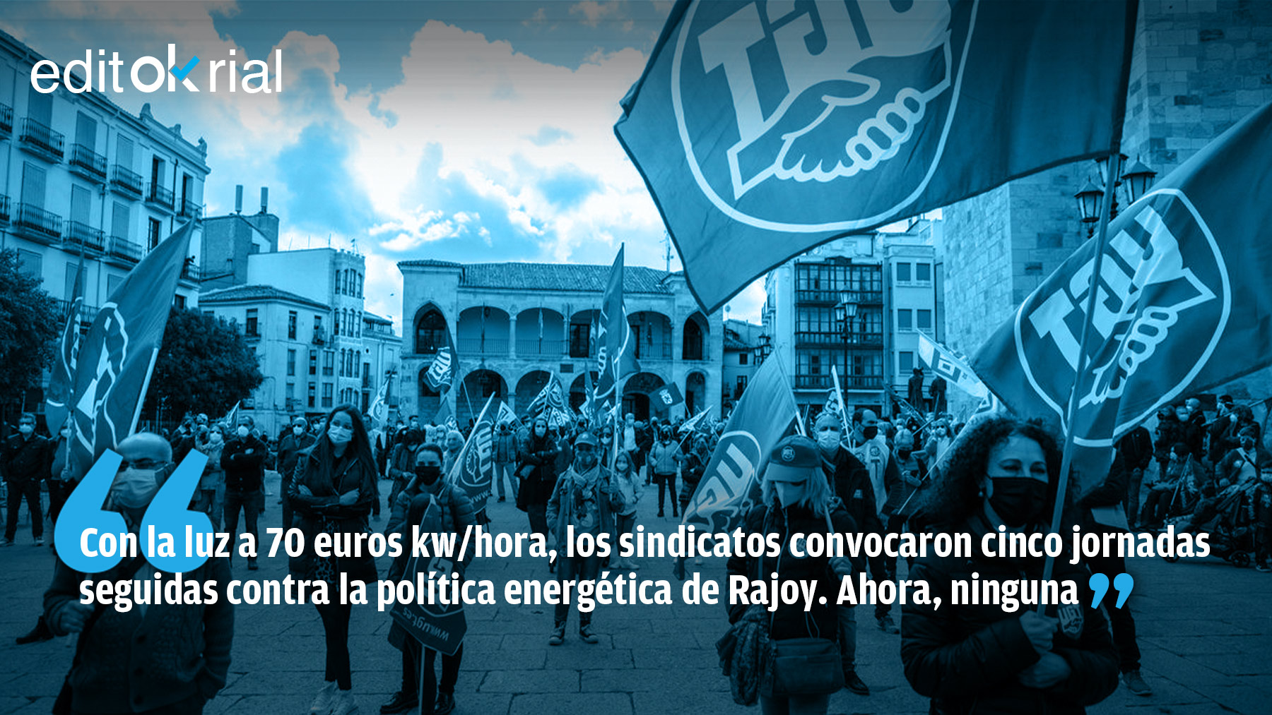En febrero de 2017 la luz estaba a 70 euros kw/hora y los sindicatos tomaron durante cinco días seguidos las calles para protestar por la política energética del Gobierno de Mariano Rajoy, que obligaba a millones de familias «a tener que elegir entre comer o poner la calefacción». Ahí estaban, en primera fila, UGT y Comisiones Obreras mostrando sus pancartas; detrás, la izquierda política, con el PSOE y Podemos haciéndose notar. Cuatro años después, el precio de la luz supera de largo los 500 euros kw/hora, con tramos diarios por encima de los 700 kw/hora, pero los sindicatos brillan por su ausencia. Será porque las negociaciones sobre la reforma laboral les han dejado materialmente sin tiempo o será -va a ser por esto- que tienen una doble moral y una cara más dura que el cemento armado. Será por esto y aquello, pero lo cierto es que las centrales sindicales mayoritarias se han puesto de canto.