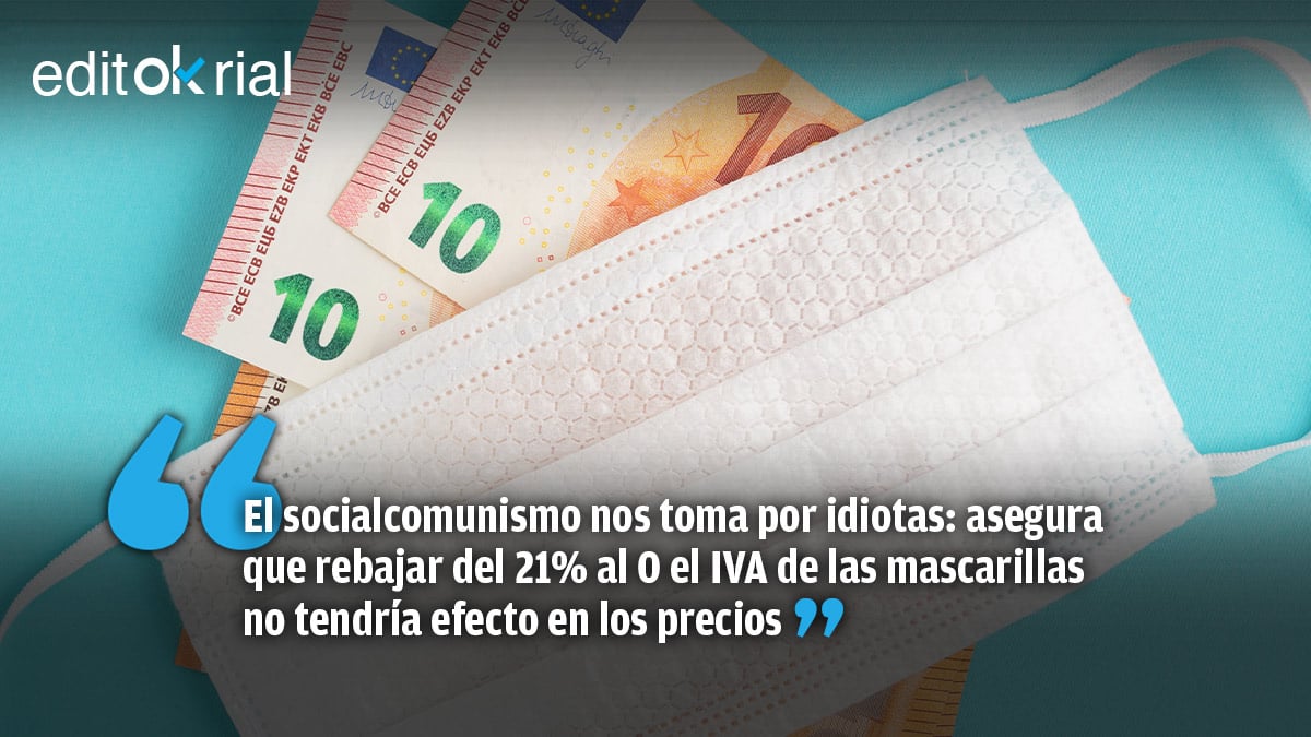El socialismo debe pensar que los españoles son idiotas y se les engaña fácilmente con argumentos de trileros. España tiene las mascarillas más caras de Europa porque el Gobierno socialcomunista sólo ha rebajado el IVA de las mascarillas quirúrgicas y no las del resto. Y todo para asegurarse unos ingresos de 800 millones de euros, lo que significa que el Ejecutivo está haciendo negocio a costa de la necesidad imperiosa que tienen los españoles de protegerse del virus.