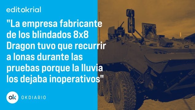 Alucinante: el Ministerio de Defensa tuvo que paralizar las entregas de la joya de los vehículos de combate españoles, el 8×8 Dragón, que fabrica Santa Bárbara Sistemas, harto de que suspendieran, una y otra vez, la prueba de lluvia, porque entraba el agua en el motor eléctrico (encargado del soporte de los sistemas del vehículo). Y es que los dragones se quedaban parados, se bloqueaba la torreta y había que sustituir distintos cables para volver a ponerlos en funcionamiento. Cómo sería la cosa que recurrieron al uso de lonas para evitar que le cayera agua al mencionado motor. Parece que la pieza defectuosa ya ha sido sustituida y el VCR 8×8 Dragón se enviará a distintas bases «sin mayor problema». Bueno, con el pequeño problema de varios meses de retraso.