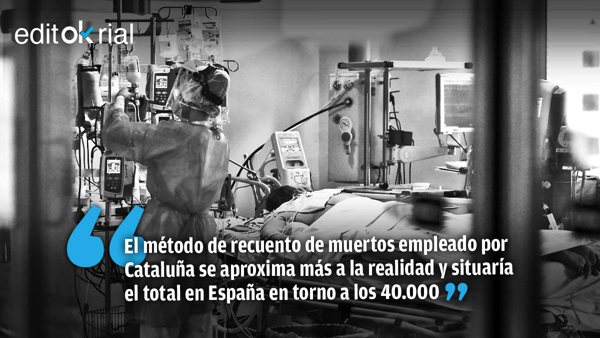 Lo que ha hecho la Generalitat de Cataluña es revelar con toda su crudeza la ocultación de muertos que provoca el procedimiento de conteo de víctimas empleado por el Ministerio de Sanidad. Si el nuevo modelo empleado por Cataluña se extrapolara al resto de España, daría un resultado de 39.326 muertes. Un dato estimativo que no tiene motivos para no ser una buena aproximación a la realidad del drama que vive España. Y que es, sin duda, mucho más fidedigno de la terrible situación. Desde luego, lo que no es creíble es la estadística del Ejecutivo socialmunista. Porque es una falacia.