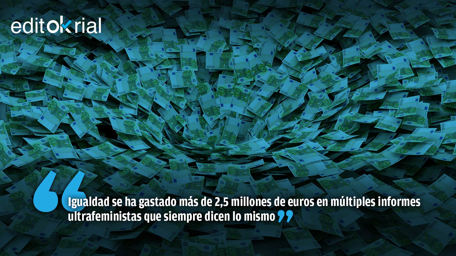 Pero, vamos a ver: si el Ministerio de Igualdad no tiene otro objeto que demostrar que la mujer es víctima de la «masculinidad hegemónica», por qué no encarga un informe «ad hoc», sólo uno, en lugar de gastarse más de 2,5 millones de euros en un cerro de estudios que siempre concluyen lo mismo. Y es que, según los datos de Hacienda, Irene Montero se repite más que el ajo. Su departamento destinó 246.439 euros a esos informes; 20.800,83 euros se dedicaron a estudiar la «igualdad de oportunidades entre hombres y mujeres»; 560.077,01 euros a la «igualdad de trato y diversidad» y 1.729.855,28 euros a la delegación contra la violencia de género. Pueden parecer distintos, pero bien mirados, son todos iguales. ¿No será que hay que untar a todos los afines al ultrafeminismo podemita y con un informe no basta? Si ya sabemos que para el Ministerio de Igualdad el color rosa «oprime y reprime a las niñas»; si ya sabemos que los estándares de la belleza femenina «cosifican» a la mujer; si ya sabemos que el hombre es un machistón por naturaleza, un vago redomado sin escrúpulos, ¿qué necesidad hay de gastarse 2,5 millones de euros para que todos los estudios lleguen a la misma la conclusión?