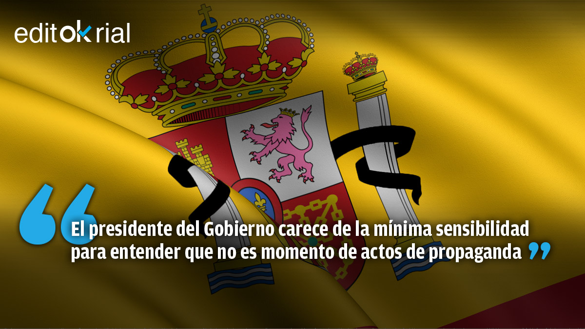 España no está para los actos propagandísticos de Pedro Sánchez, que parece carecer de la más mínima sensibilidad para entender que no es momento para estrategias de marketing electoral. Menos fiestas y más trabajar. Y con mayor eficacia, porque hasta el momento la gestión del Gobierno socialcomunista es un canto a la incompetencia. España está de luto, hay miles de familias rotas por el dolor, mientras la sociedad está dando un ejemplo de arrojo y solidaridad ante la adversidad. Y Pedro Sánchez comportándose como un fatuo. Corriendo a hacerse una foto con su equipo, sin periodistas, sin nadie que pudiera reprocharle su actitud.