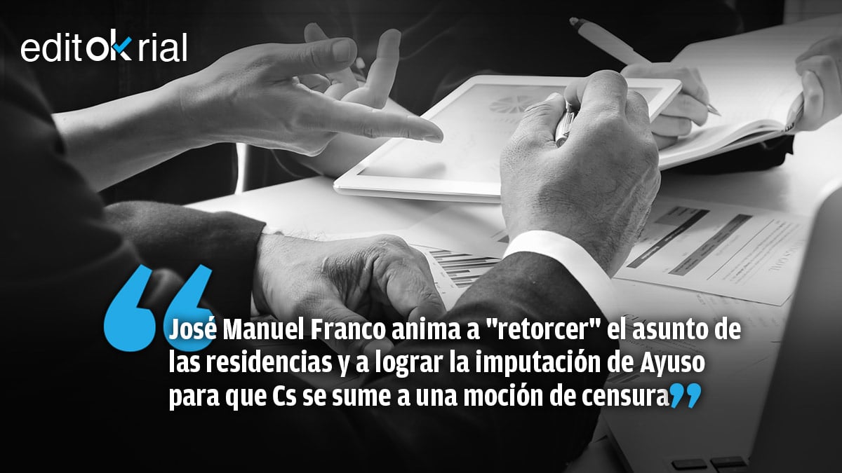 «Entendedme, tenemos que retorcer el tema de las residencias y que no busquen responsabilidades en el Gobierno de la nación porque las competencias son autonómicas». De esta manera tan descarnada se expresó el delegado del Gobierno en la Comunidad de Madrid y líder del PSOE en la región, José Manuel Franco, en un encuentro telemático organizado por el PSOE de Galapagar. El objetivo de Franco es claro: «retorcer» el caso de las residencias y «manifestarse, aunque luego os tenga que multar», para lograr la imputación de la presidenta de la Comunidad de Madrid, Isabel Díaz-Ayuso, por un «delito de cohecho impropio» en relación con el asunto del hotel en el que pasó el confinamiento.