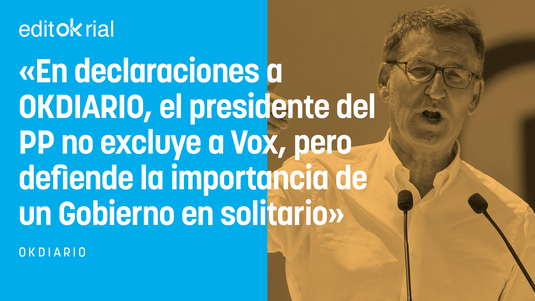 La entrevista de OKDIARIO al presidente del PP, Alberto Núñez Feijóo, sirve para hacerse una idea de las voluntades políticas de quien cuenta con las mayores posibilidades de convertirse en el próximo presidente del Gobierno de España. Feijóo apunta una idea clave: dado que, según coinciden en señalar todas las encuestas, es el único que puede aspirar a un Ejecutivo monocolor, el candidato de los populares no oculta su intención de -con permiso de la aritmética parlamentaria- formar un Ejecutivo en solitario, pero deja claro que con Vox «se puede gobernar y se puede pactar porque respeta la Constitución». Rompe así de raíz el relato político-mental de una izquierda que sigue agitando el fantasma de la ultraderecha, tratando de demonizar cualquier aproximación a los de Santiago Abascal.