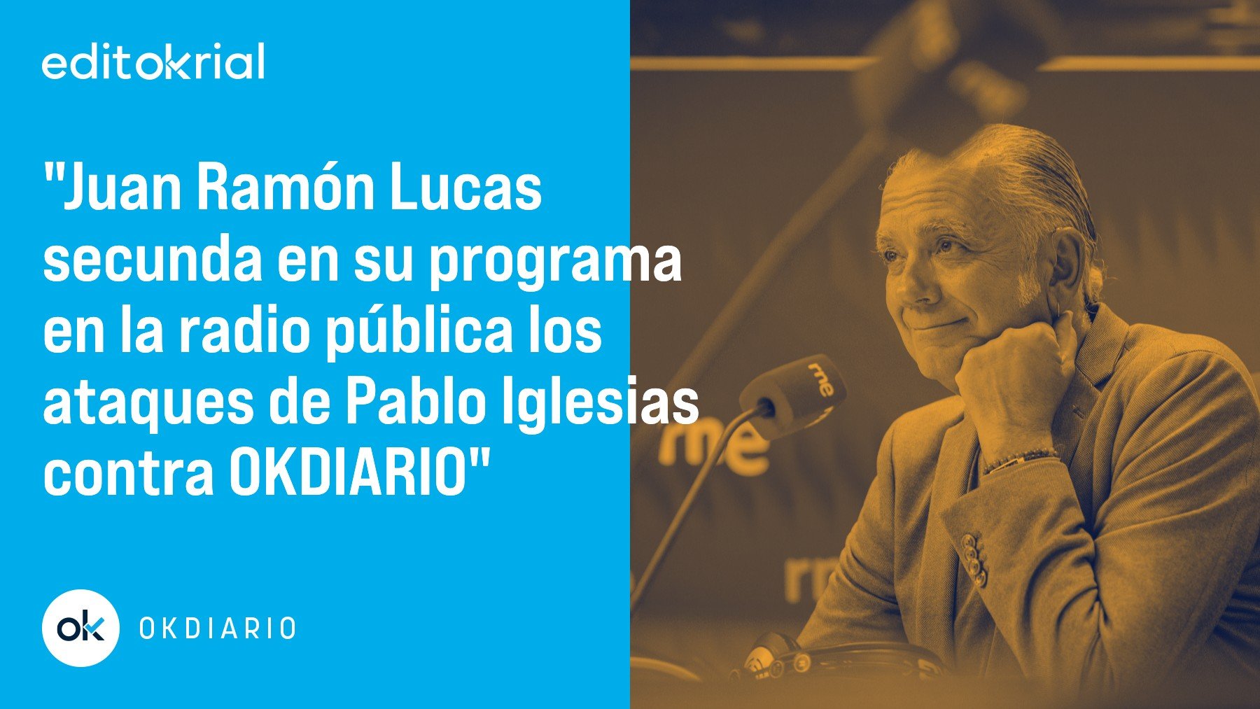 Que Pablo Iglesias haya vuelto a arremeter contra OKDIARIO, además de un motivo de orgullo, es absolutamente normal, de modo que sus ataques los tomamos como la prueba de que vamos por el buen camino. Que los ataques de Iglesias contra OKDIARIO sean secundados de forma pastueña por el conductor del programa Las mañanas de RNE, Juan Ramón Lucas, no es que nos sorprendan, pero merecen una reflexión. El periodista avaló el exabrupto del podemita contra este diario con un «No puedo estar más de acuerdo». Cada cual se gana la vida como puede y se convierte en mamporrero de quien considere oportuno, pero Juan Ramón Lucas conduce un programa en una radio pública y, en consecuencia, tiene que guardar las formas y aparentar cierta neutralidad.