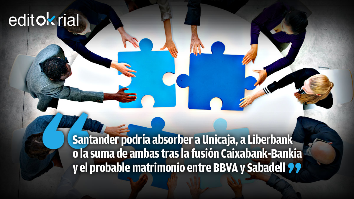 En las actuales circunstancias, las fusiones bancarias se han convertido en la vía para mejorar la solvencia y liquidez de las entidades de crédito. El objetivo es reforzar el sistema financiero español en un momento especialmente delicado para la economía nacional. La reducción de costes es condición necesaria para que la banca pueda ser rentable, de modo que que la fusión de CaixaBank y Bankia, más el probable matrimonio entre BBVA y Sabadell, y la eventual absorción de Unicaja o Liberbank por parte de Santander parecen configurar un escenario nuevo en el que la solvencia venga por la vía de la unión de fuerzas. El objetivo es alcanzar un sistema financiero sólido, capaz de resistir las turbulencias y marejadas de un mercado regido por la más absoluta incertidumbre.