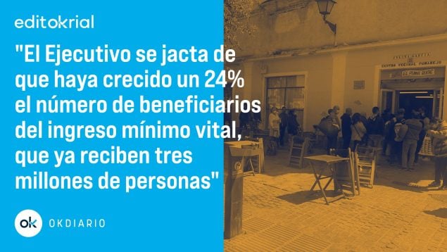 Que tres millones de personas en España carezcan de recursos y se encuentren en situación de vulnerabilidad económica -sus ingresos tienen que ser menores de 7.200 euros anuales y si son dos adultos con dos hijos la cantidad no puede exceder de 15.021 euros- es una tragedia que el Gobierno de España convierte en un triunfo. Sólo así se entiende que el Ejecutivo haya celebrado el hecho de que se haya producido «un incremento del 24% en el número de beneficiarios respecto al año anterior». Es decir, de un año a otro el número de personas que percibe esta ayuda ha crecido en una cuarta parte, lo que significa que, más allá de la cobertura que ofrece el Estado, el incremento es el retrato de un país que no va «como un cohete», como se jacta Pedro Sánchez. El Gobierno ha respondido a una pregunta parlamentaria sobre las «previsiones acerca de revisar a fondo el diseño del ingreso mínimo vital para abordar los graves problemas que denuncia el Tribunal de Cuentas y la AIReF [Autoridad Independiente de Responsabilidad Fiscal]», que pusieron pegas al diseño, gestión, control y seguimiento de la prestación.