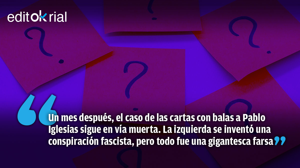 ¿Y de las otras cartas amenazantes, qué?, se preguntaran ustedes. La respuesta es sencilla: nada de nada. Lo que era una amenaza en toda regla al Estado forma parte de un dosier que duerme en un cajón. La investigación está «paralizada», tal vez porque no haya nada que investigar y todo fuera un ejercicio bastardo de instrumentalización política al servicio de los intereses del socialcomunismo. Dicen que las cosas están en «punto muerto»; o sea, que el caso se murió. Durante unos días aquello sirvió para tratar de excitar la campaña, agitando el fantasma de un siniestro plan de desestabilización de la democracia con el único fin de impedir que Ayuso gobernara en Madrid. Pero el plan no coló, Ayuso se salió en las urnas, el PSOE de Sánchez se metió un leñazo de aupa y Pablo Iglesias tuvo que marcharse con la coleta entre las piernas. Todo fue una gran mentira.