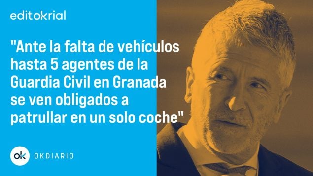 Cinco agentes en un vehículo vetusto, con más de 400.000 kilómetros, patrullando por la provincia de Granada es la imagen lamentable que tiene que soportar la Guardia Civil por la inacción del ministro de Interior, Fernando Grande-Marlaska. Y ya no es sólo una cuestión de imagen, sino que las condiciones de trabajo de los guardias civiles no pasan el listón de lo admisible. La falta de vehículos oficiales, consecuencia del abandono por parte del Gobierno, se traduce en que sólo haya uno o dos operativos –en el mejor de los escenarios–, de manera que los agentes tienen que patrullar al modo del coche de San Fernando, un poquito a pie y otro caminando, pues no hay presupuesto para reparar los coches. Volvamos al principio, porque lo de los cinco agentes en un vehículo oficial no es una exageración, sino la descripción cabal de lo ocurrido recientemente. Iban los cinco guardias civiles de patrulla y se produjo una detención, obligando a dos de los agentes –para dar cabida al detenido– a bajarse del coche y tener que ser trasladados a sus dependencias oficiales en un vehículo de la Policía Local.