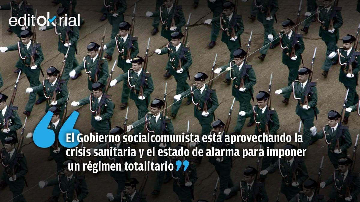 Si el general de la Guardia Civil no ha sufrido ningún lapsus -que no parece- sus palabras son la prueba del nueve de que el Ejecutivo socialcomunista está decidido a triturar la libertad de expresión e información. Había indicios de que esa era su estrategia, pero ahora tenemos la confirmación. La Guardia Civil trabaja para defender al Gobierno. Dirán que se ha tratado de un lapsus, pero la claridad con la que se ha explicado el alto mando de la Benemérita no deja lugar a dudas. El Gobierno socialcomunista está aprovechando la crisis sanitaria y el estado de alarma para imponer un régimen totalitario en el que las voces de los discrepantes sea silenciada. La libertad está siendo secuestrada en España y urge un movimiento social de respuesta para evitar que el socialcomunismo logre su objetivo. Porque una cosa es que estemos confinados en nuestros domicilios y otra, muy distinta, que nos pretendan confinar la libertad.