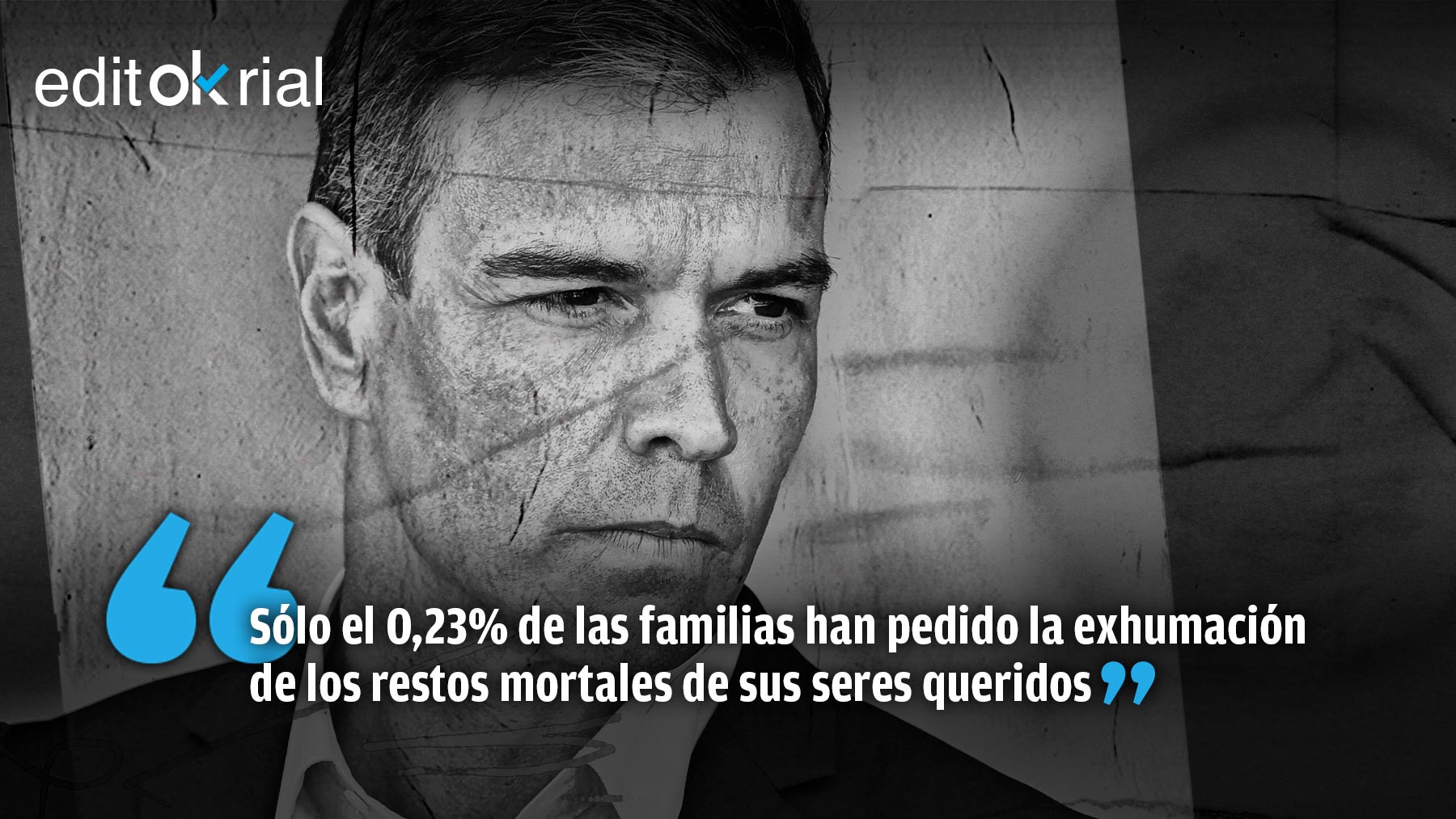 La «memoria democrática» del Gobierno socialcomunista no buscó nunca reparar el dolor de las familias ni hacer justicia. Ha sido -y es- una descomunal estrategia de propaganda para tensionar al máximo a la sociedad española y rentabilizar electoralmente el guerracivilismo que caracteriza a un Ejecutivo que decidió hurgar en las heridas del pasado ante su incapacidad evidente para hacer frente a los problemas de la sociedad española. La «memoria democrática» de Sánchez ha sido -y es- un burdo ejercicio de sectarismo ideológico adornado de gestos fatuos que no han contribuido a otra cosa que a mostrar el rostro revanchista de un Gobierno reaccionario en el fondo y en las formas. Franco fue la añagaza, pero después de su exhumación todo ha quedado en nada, porque hasta los más allegados a las víctimas de la Guerra Civil y la dictadura se han sentido utilizados.