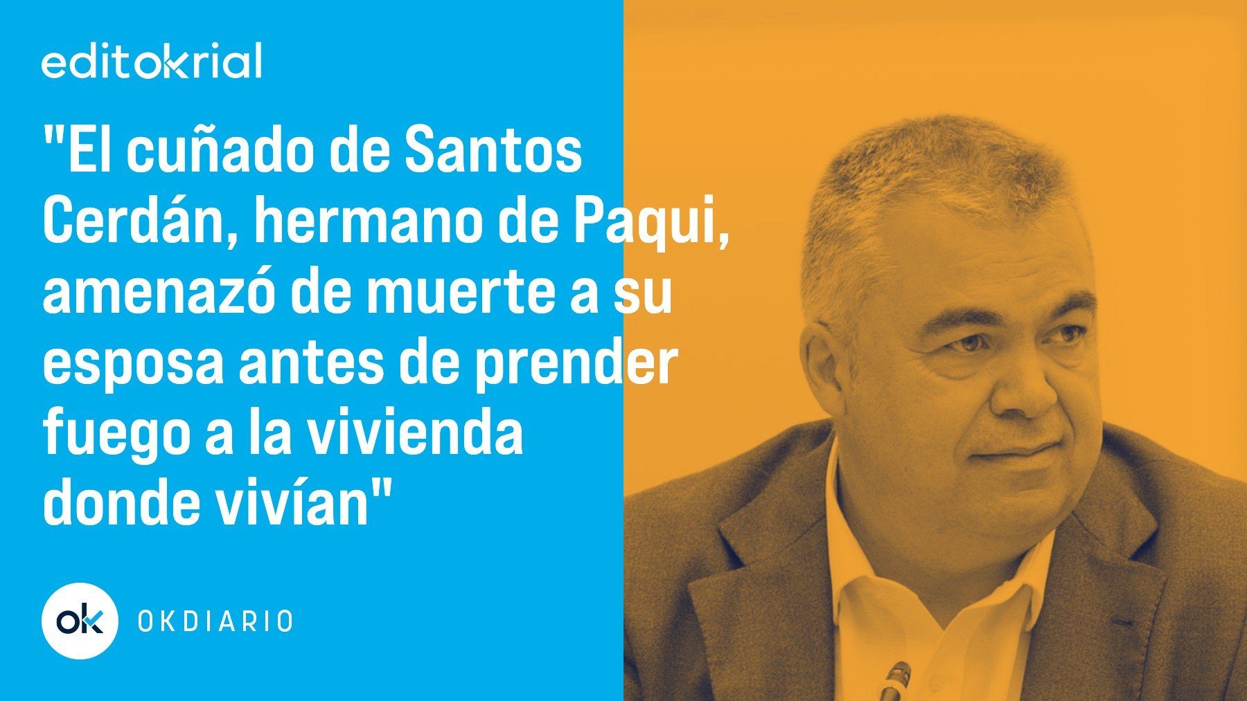 La familia de Santos Cerdán es una caja de sorpresas. Como en todas, hay de todo, pero en la del ex secretario de Organización del PSOE hay de todo por partida doble o triple. Paqui, la mujer de Cerdán, amenazó a una periodista de OKDIARIO al grito de «estoy hasta los cojones de este puto país», y su hermano Antonio, cuñado de Cerdán, amenazó a su mujer y al hermano de ésta al grito de «te voy a matar, a arrancar la cabeza, te voy a ver vestido de luto».