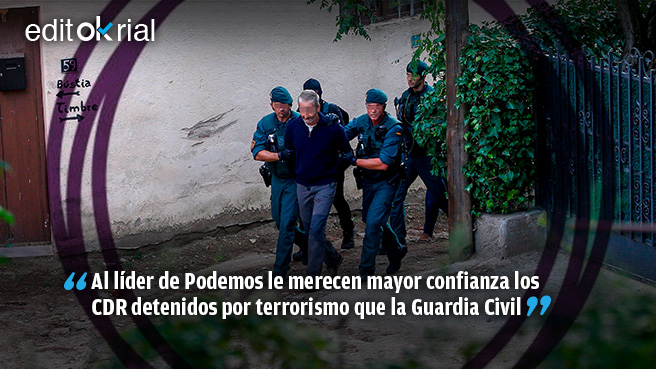 El problema de Iglesias es que es víctima de una irrefrenable pulsión ideológica que le lleva siempre a cuestionar los pilares básicos del Estado de Derecho, muy en la línea de lo que hace el independentismo. Que a Pablo Iglesias le merezcan más dudas la actuación de la Benemérita que la actuación presuntamente terrorista de los miembros de los CDR le convierte, a ojos del separatismo, en un chollo, en un auténtico tesoro para su estrategia victimista.