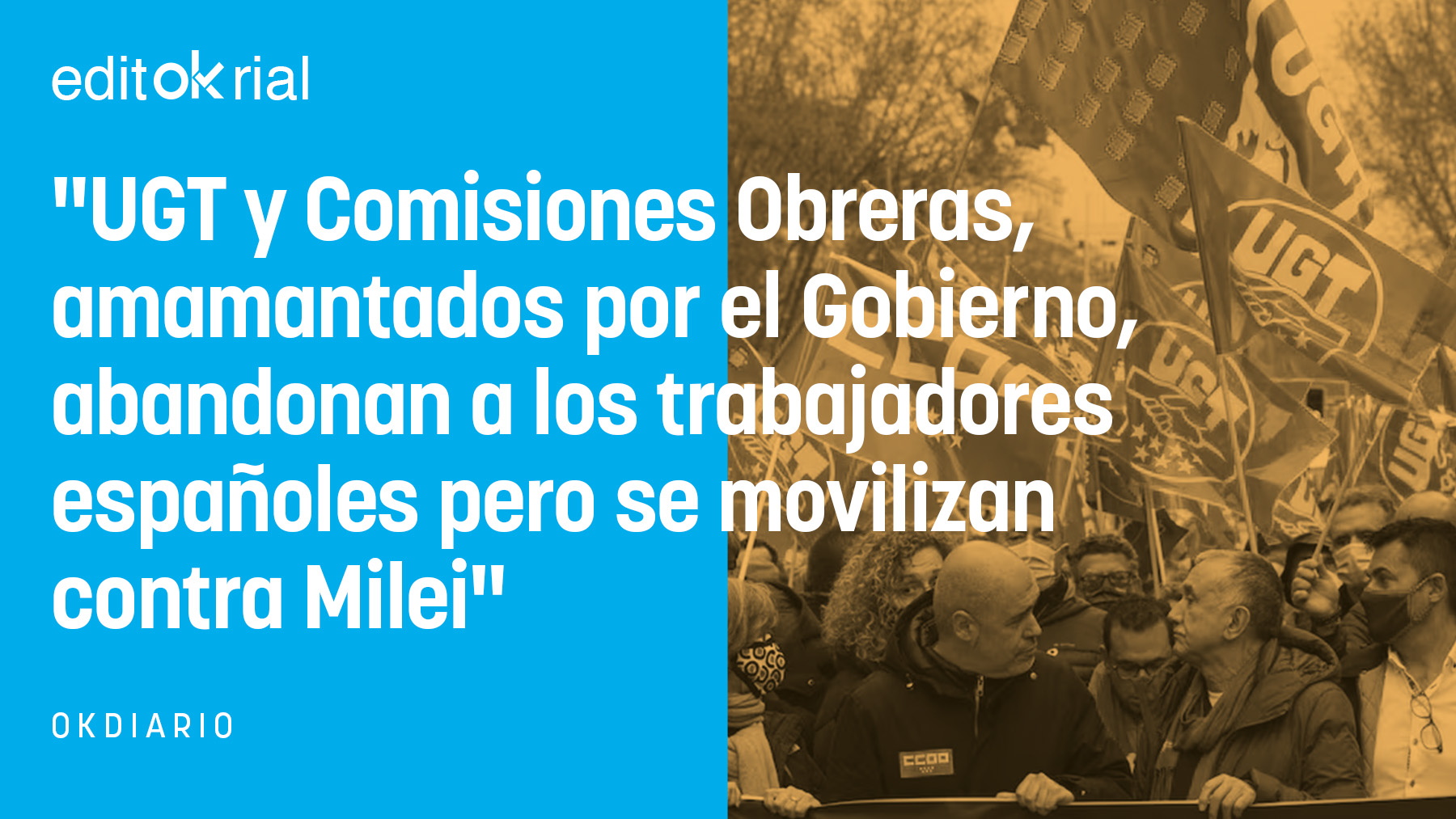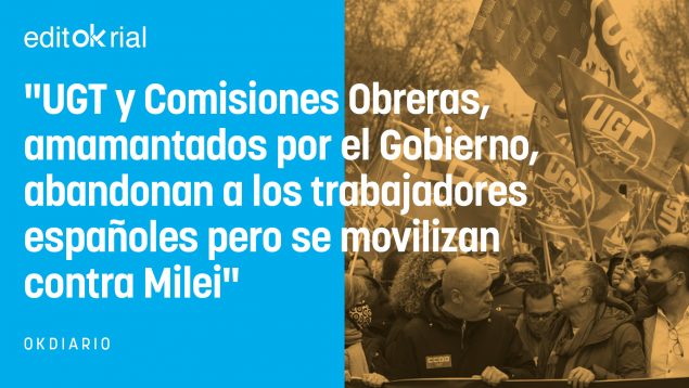 Los sindicatos UGT y Comisiones Obreras, estómagos agradecidos del sanchismo, han decidido que, como en España la clase trabajadora vive de lujo, lo urgente es montarle la parda al presidente de Argentina, Javier Milei, a través de una concentración frente a la embajada de la nación iberoamericana. Llevan casi seis años mamando a boca llena de las ubres de un Gobierno que ha comprado la paz social a cambio de subvenciones y demás mamandurrias -lo que Milei, precisamente, ha suprimido en Argentina- y ahora tienen el cuajo de echarse a la calle contra la política del presidente del país sudamericano. Hay que tener un rostro de cemento armado y muy poca vergüenza para guardar un atronador silencio ante los problemas que atraviesan los españoles y movilizarse contra las políticas del máximo dignatario argentino.