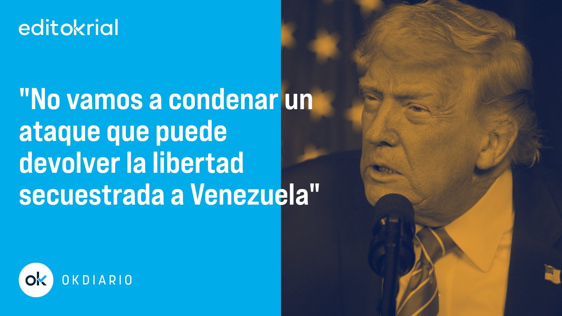 La posición de OKDIARIO no puede ser otra que la de estar con el pueblo venezolano y compartir estos cruciales momentos con el deseo de que la narcodictadura de paso a un tiempo nuevo. Y, por supuesto, no vamos a condenar un ataque que puede devolver la libertad secuestrada a Venezuela. Que lo haga la izquierda y se retrate en su inmensa hipocresía. La caída de Maduro es para cualquier demócrata un motivo de satisfacción, de modo que si las autodenominadas fuerzas del progresismo español no se alegran es porque su concepto de la democracia es tan estrecho que cualquiera diría que la libertad en Venezuela les provoca escalofríos. Por algo será. Por nuestra parte, solo queda gritar, en España y Venezuela, que la democracia no se de defiende con cadenas