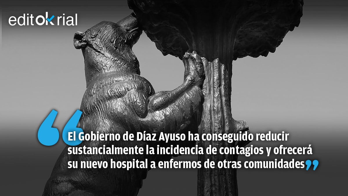 La Comunidad de Madrid, que ha soportado la feroz y sectaria embestida política del socialcomunismo, obsesionado con acabar con Isabel Díaz Ayuso, ha impuesto un plan de restricción de movilidad por áreas de salud que, mal que le pese a Pedro Sánchez, ha funcionado. En un mes, la mejora es sustancial, al pasar de ser el territorio con mayor incidencia de contagios a uno de los que presenta tasas menores, un éxito evidente que ha permitido a la comunidad evitar el riesgo de colapso hospitalario. La región gobernada por Isabel Díaz Ayuso se ha convertido en el referente nacional en rebaja del impacto de la enfermedad y en capacidad de camas disponibles para el tratamiento de la COVID. La Comunidad tiene listo su nuevo hospital de referencia frente el coronavirus, el Enfermera Isabel Zendal. Las camas sobrantes de este hospital se ofrecerán al resto de regiones españolas para aliviar la falta de camas en otros territorios, lo que es una demostración de solidaridad muy reconfortante en estos tiempos en los que el Gobierno ha politizado hasta la náusea la pandemia.