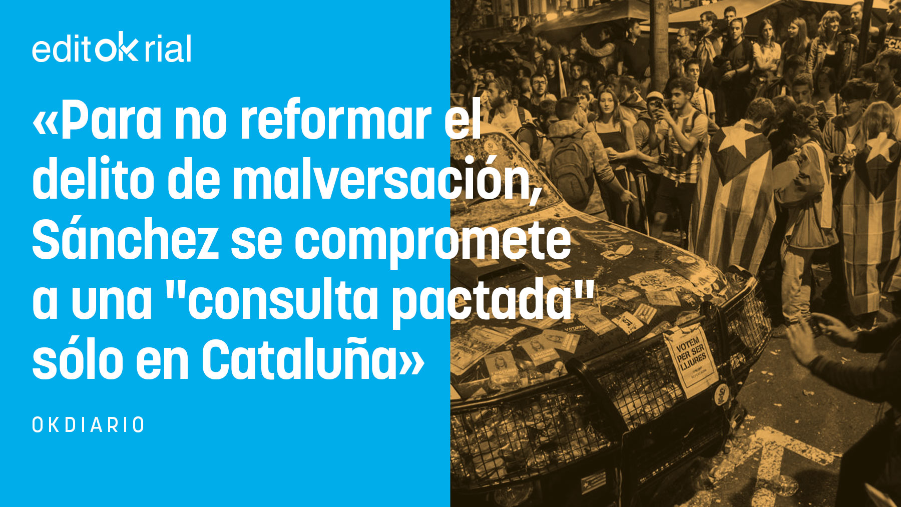 Estamos ante una trampa y una burla a la Constitución, porque se trata, en definitiva, de allanar el camino para un referéndum sobre la independencia a través de una consulta previa y exclusiva para Cataluña que sería utilizada por Sánchez y los golpistas catalanes para vender la falsa idea de que todo se está haciendo respetando las leyes. Y el fraude, gigantesco, sería que el resto de españoles no tendría voz ni voto. Ése es el plan que negocian Pedro Sánchez y el Gobierno de Cataluña: toda una estrategia para burlar a la Constitución bajo una apariencia de falsa legalidad. ¿Para qué pedir reformar el delito de malversación si Sánchez se lo va a poner en bandeja?